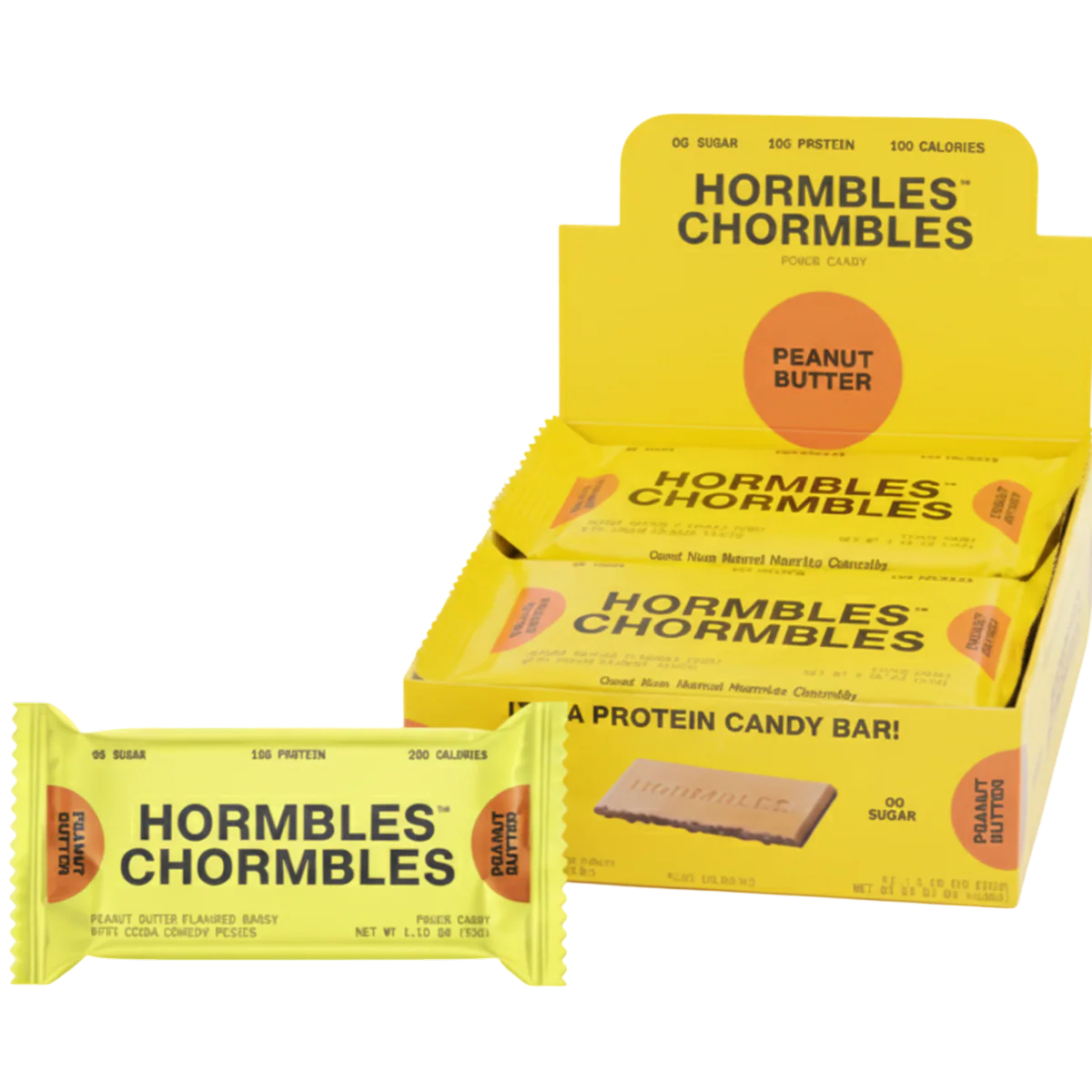 Hormbles Chormbles Peanut Butter Protein Candy Bars offer a creamy peanut butter flavor combined with crunchy cocoa bits for an indulgent snack experience. Each bar delivers 10 g of protein, 0 g of sugar, and 100 calories, making it a satisfying, guilt‑reduced treat that balances taste and nutrition.